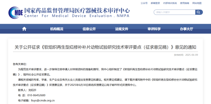 6月9日,國家藥監局器審中心發布《軟組織再生型疝修補補片動物試驗研究技術審評要點(征求意見稿)》(以下簡稱《要點》),并向社會公開征求意見。