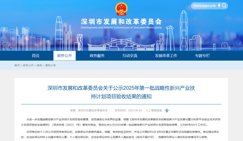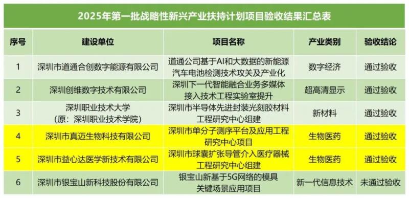 近日,深圳市發展和改革委員會公示了《2025年第一批戰略性新興產業扶持計劃項目驗收結果》,本期共有6個項目(5個通過驗收1個未通過驗收),5個通過驗收的項目中有2個為“生物醫藥”領域的,具體明細如下: