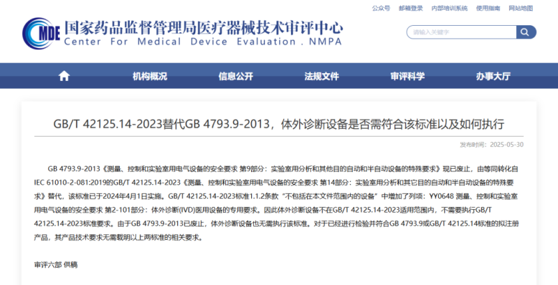 GB/T 42125.14-2023標準1.1.2條款“不包括在本文件范圍內的設備”中增加了列項:YY 0648 測量、控制和實驗室用電氣設備的安全要求 第2-101部分:體外診斷(IVD)醫用設備的專用要求。因此體外診斷設備不在GB/T 42125.14-2023適用范圍內,不需要執行GB/T 42125.14-2023標準要求。由于GB 4793.9-2013已廢止,體外診斷設備也無需執行該標準。對于已經進行檢驗并符合GB 4793.9或GB/T 42125.14標準的擬注冊產品,其產品技術要求無需載明以上兩標準的相關要求。