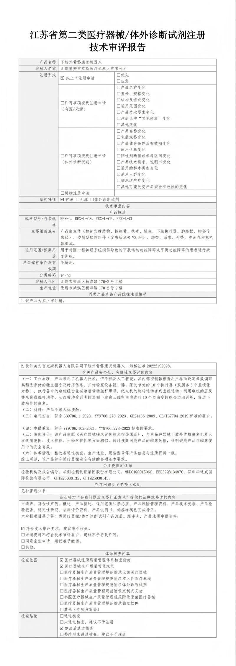 近日,江蘇省藥監局公布了2025年5月批準注冊的磁刺激治療儀、重組膠原蛋白液體敷料、生命體征檢測儀、一次性使用無菌皮膚滾針、短波治療儀、艾灸儀、醫用透明質酸鈉凝膠敷料、下肢外骨骼康復機器人等164個醫療器械產品目錄,同時隨附了所有產品的技術審評報告,我們其中“下肢外骨骼康復機器人”(預期用途:用于對因中樞神經系統損傷導致的下肢運動功能障礙或平衡功能障礙的患者進行康復訓練)的技術審評報告以圖片形式轉載如下: