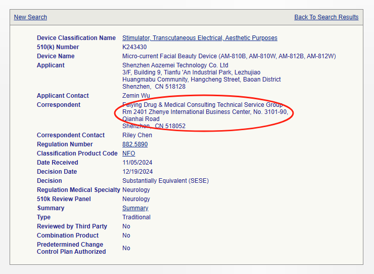 2024年底,我們成功輔導(dǎo)深圳一家企業(yè)獲批微電流美容儀的510(k),值得一提的是,由于該產(chǎn)品融合了微電流與光療雙重技術(shù)(基于不同的預(yù)期用途、技術(shù)特性及FDA審評(píng)要求),它同時(shí)擁有2個(gè)K號(hào),其中微電流的K號(hào)明細(xì)如下: