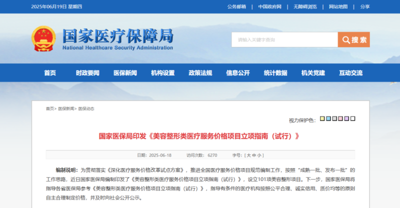 6月18日,國家醫保局印發了《美容整形類醫療服務價格項目立項指南(試行)》(以下簡稱《指南》),共規定了101項美容整形項目的服務價格相關內容,包括價格構成、計價單位等,如光/激光美容治療費的計價單位為光斑,射頻、超聲、微針等美容治療費的計價單位均為平方厘米……