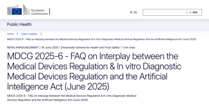 近日,歐盟委員會(huì)發(fā)布一份指南文件《關(guān)于醫(yī)療器械法規(guī)與體外診斷醫(yī)療器械法規(guī)與人工智能法案(2025年6月)之間相互作用的常見問題解答》,針對(duì)《人工智能法案》(AIA)與《醫(yī)療器械法規(guī)》(MDR)或《體外診斷醫(yī)療器械法規(guī)》(IVDR)聯(lián)合使用最常見問題,提供了相關(guān)解答方案。該常見問題解答(FAQ)主要面向(但不限于)醫(yī)療器械制造商、公告機(jī)構(gòu)及主管機(jī)構(gòu)。