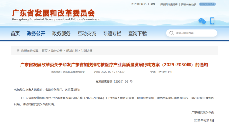 近日,廣東省發展和改革委員會發布《廣東省加快推動核醫療產業高質量發展行動方案(2025-2030年)》(以下簡稱《方案》),從提升核醫療科技創新水平、健全醫用同位素供應體系等8方面共提出了20條措施,《方案》全文如下: