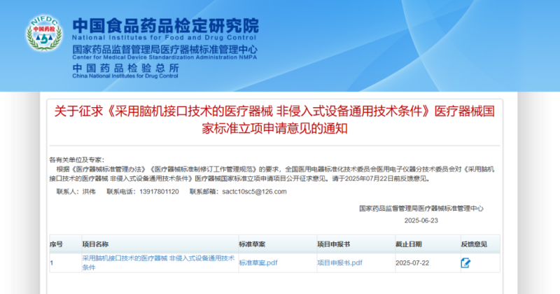 6月23日,國家藥監局醫療器械標管中心發布《采用腦機接口技術的醫療器械 非侵入式設備通用技術條件》醫療器械國家標準立項申請,同時隨附了標準草案,并向社會公開征求意見。