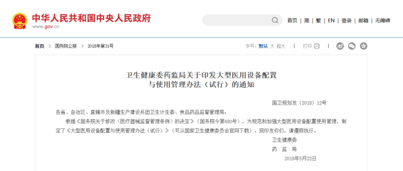 根據(jù)《大型醫(yī)用設(shè)備配置與使用管理辦法(試行)》,大型醫(yī)用設(shè)備,是指使用技術(shù)復(fù)雜、資金投入量大、運行成本高、對醫(yī)療費用影響大且納入目錄管理的大型醫(yī)療器械。