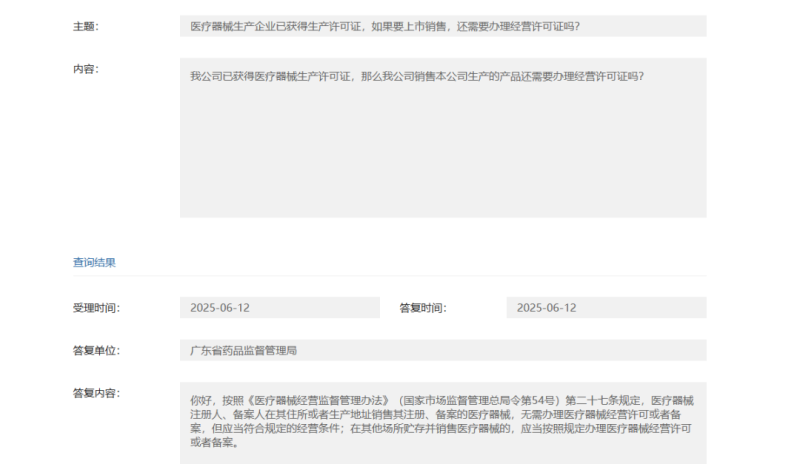 根據(jù)廣東省藥監(jiān)局的答復(fù),按照《醫(yī)療器械經(jīng)營(yíng)監(jiān)督管理辦法》(國家市場(chǎng)監(jiān)督管理總局令第54號(hào))第二十七條規(guī)定,醫(yī)療器械注冊(cè)人、備案人在其住所或者生產(chǎn)地址銷售其注冊(cè)、備案的醫(yī)療器械,無需辦理醫(yī)療器械經(jīng)營(yíng)許可或者備案,但應(yīng)當(dāng)符合規(guī)定的經(jīng)營(yíng)條件;在其他場(chǎng)所貯存并銷售醫(yī)療器械的,應(yīng)當(dāng)按照規(guī)定辦理醫(yī)療器械經(jīng)營(yíng)許可或者備案。