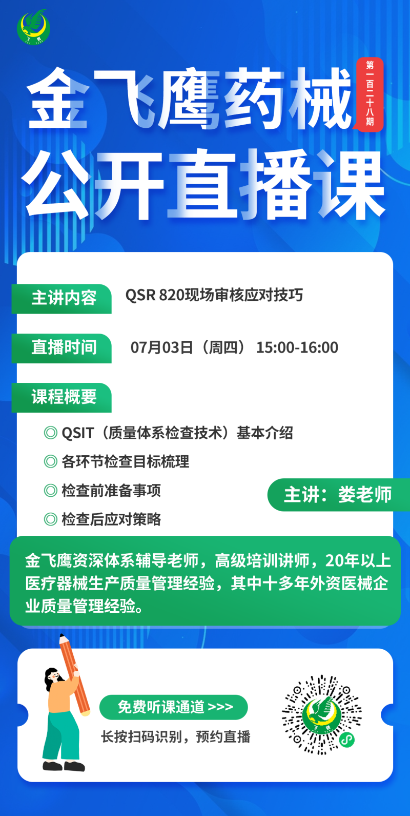7月3日下午3點,金飛鷹資深體系輔導(dǎo)老師、有著十多年外資醫(yī)械企業(yè)質(zhì)量管理經(jīng)驗的婁老師給大家?guī)怼禥SR 820現(xiàn)場審核應(yīng)對技巧》,他將從QSIT(質(zhì)量體系檢查技術(shù))的基本介紹出發(fā),深入解析FDA現(xiàn)場檢查的核心要點。在此基礎(chǔ)上,本次課程還將給出企業(yè)在檢查前及檢查后的準(zhǔn)備事項及應(yīng)對策略,為企業(yè)應(yīng)對FDA檢查打下堅實基礎(chǔ)。
