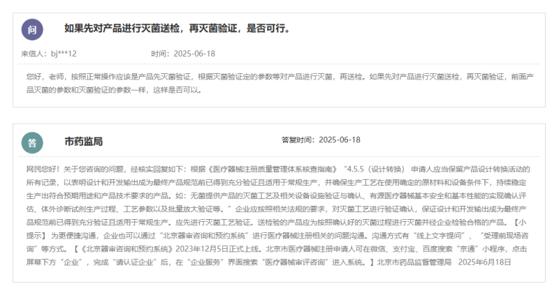 根據(jù)北京市藥監(jiān)局的答復(fù),根據(jù)《醫(yī)療器械注冊(cè)質(zhì)量管理體系核查指南》“4.5.5(設(shè)計(jì)轉(zhuǎn)換) 申請(qǐng)人應(yīng)當(dāng)保留產(chǎn)品設(shè)計(jì)轉(zhuǎn)換活動(dòng)的所有記錄,以表明設(shè)計(jì)和開(kāi)發(fā)輸出成為最終產(chǎn)品規(guī)范前已得到充分驗(yàn)證且適用于常規(guī)生產(chǎn),并確保生產(chǎn)工藝在使用確定的原材料和設(shè)備條件下,持續(xù)穩(wěn)定生產(chǎn)出符合預(yù)期用途和產(chǎn)品技術(shù)要求的產(chǎn)品。如:無(wú)菌提供產(chǎn)品的滅菌工藝及相關(guān)設(shè)備設(shè)施驗(yàn)證與確認(rèn)、有源醫(yī)療器械基本安全和基本性能的實(shí)現(xiàn)確認(rèn)評(píng)估、體外診斷試劑生產(chǎn)過(guò)程、工藝參數(shù)以及批量放大驗(yàn)證等。”企業(yè)應(yīng)按照相關(guān)法規(guī)的要求,對(duì)滅菌工藝進(jìn)行驗(yàn)證確認(rèn),保證設(shè)計(jì)和開(kāi)發(fā)輸出成為最終產(chǎn)品規(guī)范前已得到充分驗(yàn)證且適用于常規(guī)生產(chǎn)。應(yīng)先進(jìn)行滅菌工藝驗(yàn)證。送檢驗(yàn)的產(chǎn)品應(yīng)為按照確認(rèn)好的滅菌過(guò)程進(jìn)行滅菌并經(jīng)企業(yè)檢驗(yàn)合格的產(chǎn)品。