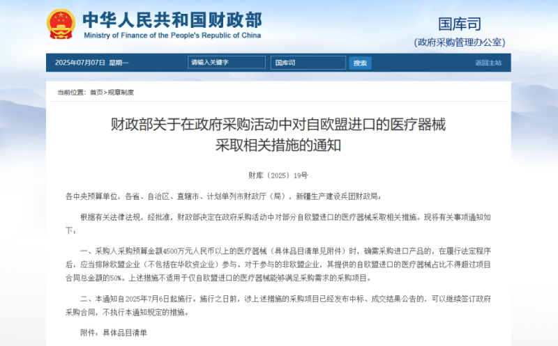 7月6日,國(guó)家財(cái)政部發(fā)布《關(guān)于在政府采購(gòu)活動(dòng)中對(duì)自歐盟進(jìn)口的醫(yī)療器械采取相關(guān)措施的通知》,具體通知事項(xiàng)如下: