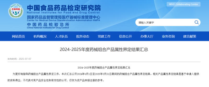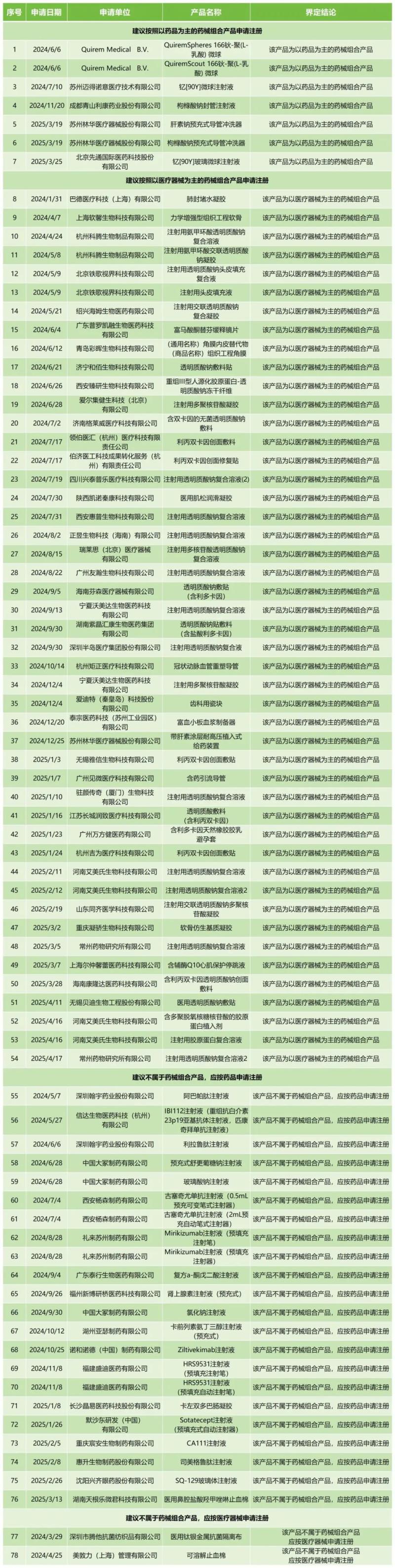 7月7日,中檢院匯總公開了2024年6月1日至2025年5月31日期間的藥械組合產品屬性界定結果,共包含78款產品,其中建議按照以藥品為主的藥械組合產品申請注冊有7款,建議按照以醫療器械為主的藥械組合產品申請注冊有47款,建議應按藥品申請注冊的有22款,建議應按醫療器械申請注冊有2款,具體明細如下: