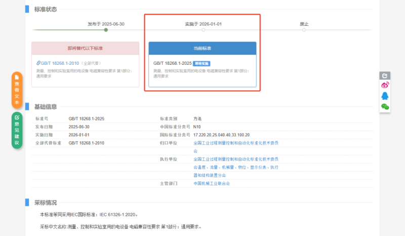 據全國標準信息公共服務平臺近日公布,GB/T 18268.1-2025《測量、控制和實驗室用的電設備 電磁兼容性要求 第1部分:通用要求》推薦性國家標準批準發布,該標準即將替代GB/T 18268.1-2010,于2026年1月1日起正式實施。據悉,該標準等同采用IEC國際標準:IEC 61326-1:2020。