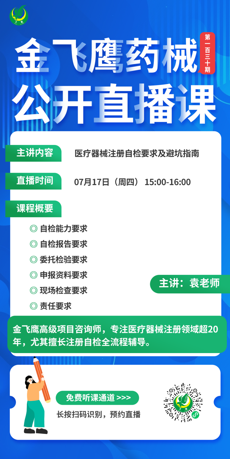 7月17日下午3點,金飛鷹高級項目咨詢師,專注醫療器械注冊領域超20年,尤其擅長注冊自檢全流程輔導的袁老師給大家帶來《醫療器械注冊自檢要求及避坑指南》,在一一梳理注冊自檢各方面要求的同時,還會結合過往的實際輔導案例給大家總結避坑指南及現場核查應對策略,感興趣的朋友記得提前預約!