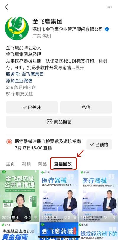 往期直播培訓課程支持回放,關注“金飛鷹藥械咨詢服務”視頻號并點擊視頻號主頁,即可查看“直播回放”哦~
