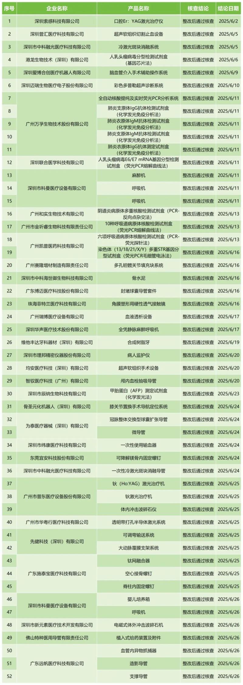 7月16日,廣東省藥監局官網公布2025年6月醫療器械注冊質量管理體系核查結果,包括深圳索感科技有限公司的口腔Er:YAG激光治療儀、廣州萬孚生物技術股份有限公司的全自動核酸提純及實時熒光PCR分析系統、廣州市普東醫療設備股份有限公司的鈥(Ho:YAG)激光治療機、深圳市科曼醫療設備有限公司的呼吸機等共計52款產品,均為“整改后通過核查”。具體明細見下方表格: