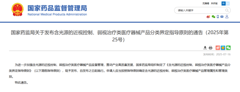 7月16日,國(guó)家藥監(jiān)局發(fā)布《含光源的近視控制、弱視治療類醫(yī)療器械產(chǎn)品分類界定指導(dǎo)原則》(以下簡(jiǎn)稱《指導(dǎo)原則》),并宣布自發(fā)布之日起施行。