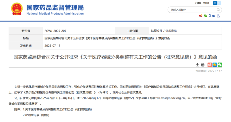 7月17日,國家藥監局發布《關于醫療器械分類調整有關工作的公告(征求意見稿)》(以下簡稱《分類調整公告》),現向社會公開征求意見。