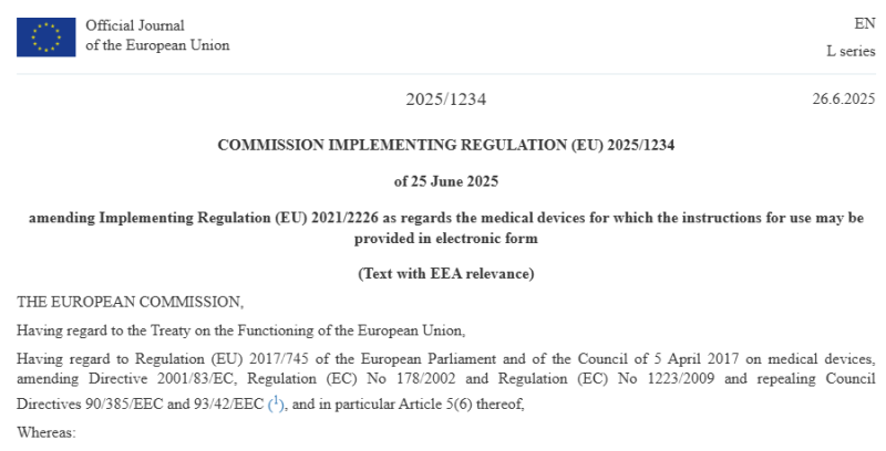 上月底,歐盟委員會發布COMMISSION IMPLEMENTING REGULATION (EU) 2025/1234,旨在對 2021 年出臺的醫療設備電子說明書相關條例Regulation(EU)2021/2226進行重要修訂,核心變化圍繞電子說明書的適用范圍與實施細節。