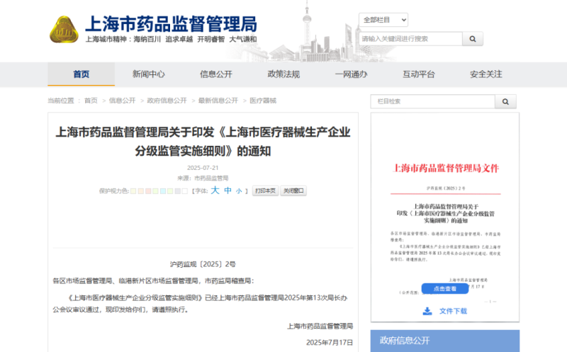 7月21日,上海市藥監局發布《上海市醫療器械生產企業分級監管實施細則》(以下簡稱《實施細則》),《實施細則》適用于對上海市醫療器械生產企業開展的日常監督管理活動,所稱生產企業包括醫療器械注冊人、備案人以及受托生產企業。