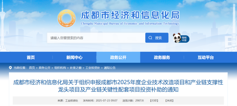 7月23日,成都市經濟和信息化局發布《關于組織申報成都市2025年度企業技術改造項目和產業鏈支撐性龍頭項目及產業鏈關鍵性配套項目投資補助的通知》(以下簡稱《通知》),其中提到,對符合條件的企業,給予最高1000萬元補助。《通知》具體內容如下:
