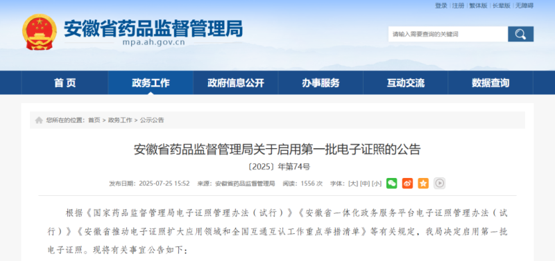 電子證照同步在安徽省藥品監督管理局門戶網站電子證照公示欄目(https://mpa.ah.gov.cn)公示。該公告同時提到,電子證照啟用前該局已頒發的相關紙質證書(含正本、副本、附頁和變更記錄頁),在有效期內繼續使用。