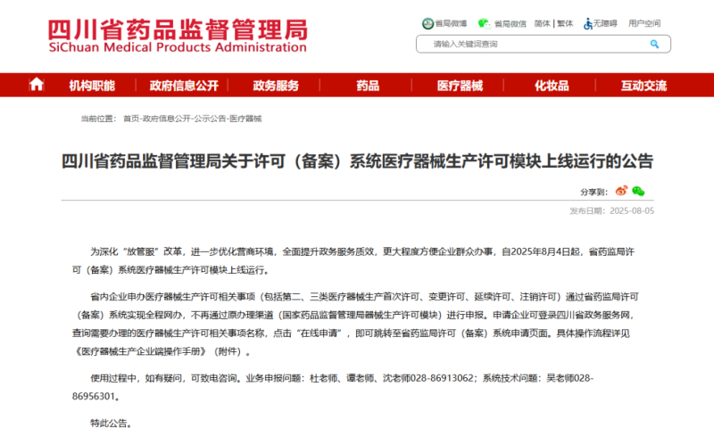 8月4日,四川省藥監局發布《關于許可(備案)系統醫療器械生產許可模塊上線運行的公告》(以下簡稱《公告》),其中提到,2025年8月4日起,省藥監局許可(備案)系統醫療器械生產許可模塊上線運行。