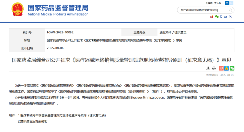 今年4月,《醫療器械網絡銷售質量管理規范》正式出臺,緊隨其后,8月6日,國家藥監局《醫療器械網絡銷售質量管理規范現場檢查指導原則(征求意見稿)》(以下簡稱《指導原則》),并向社會公開征求意見。