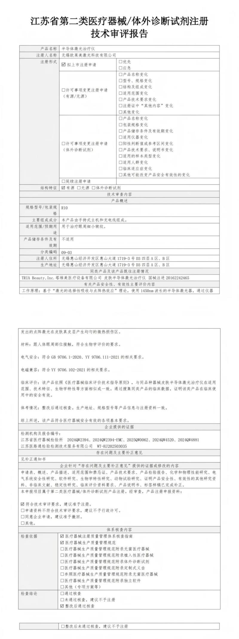 8月12日,江蘇省藥監(jiān)局公布了2025年7月批準(zhǔn)注冊的神經(jīng)肌肉電刺激儀、醫(yī)用分子篩制氧機、半導(dǎo)體激光治療儀、紅藍光治療儀、全自動沖擊波治療儀、醫(yī)用絲素蛋白凝膠敷料、超聲波治療儀、醫(yī)用重組膠原蛋白液體敷料、醫(yī)用壓縮式霧化器、一次性醫(yī)用激光光纖136醫(yī)療器械產(chǎn)品目錄,同時隨附了所有產(chǎn)品的技術(shù)審評報告,我們將其中“半導(dǎo)體激光治療儀預(yù)期用途:用于治療眼周細小皺紋的技術(shù)審評報告以圖片形式轉(zhuǎn)載如下: