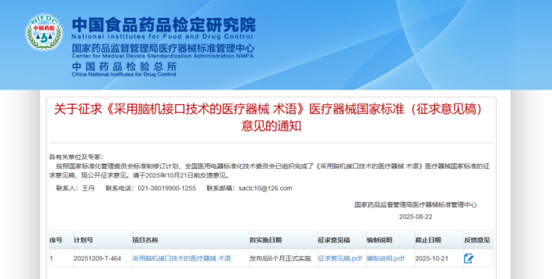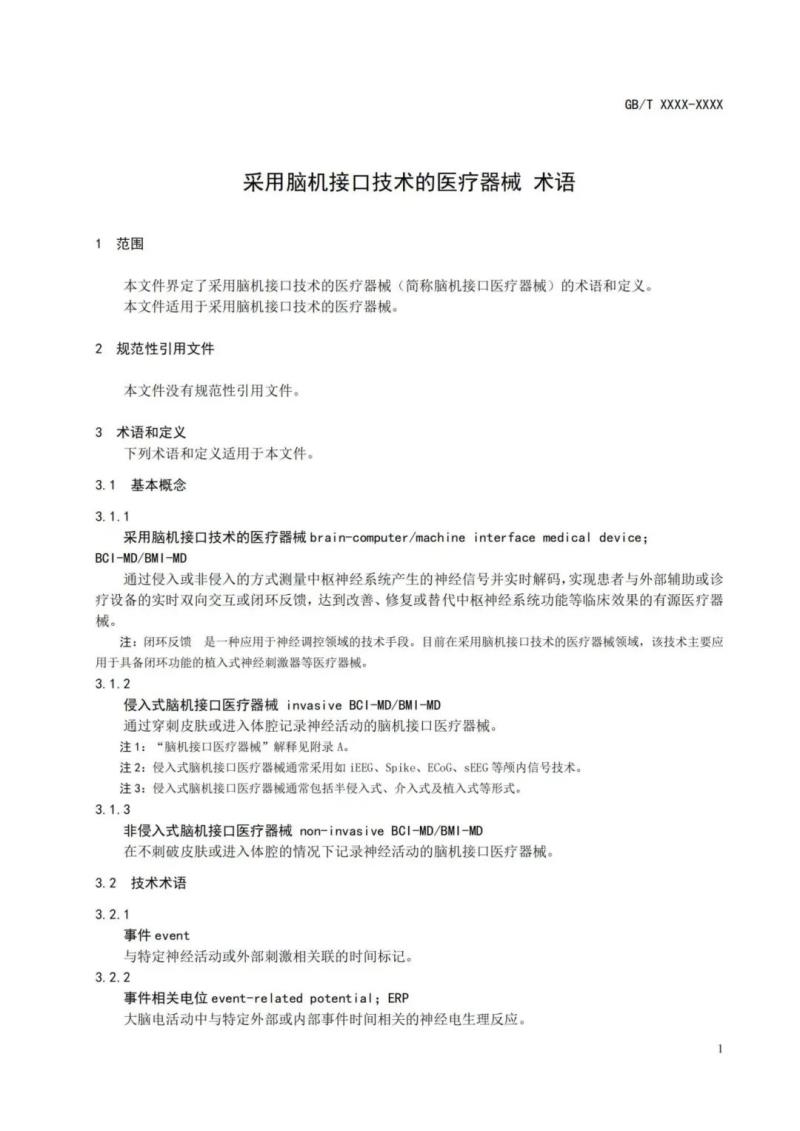 近日,國家藥品監督管理局醫療器械標準管理中心發布《采用腦機接口技術的醫療器械 術語》醫療器械國家標準的征求意見稿,并向社會公開征求意見,同時提到,該標準將于發布后6個月正式實施。