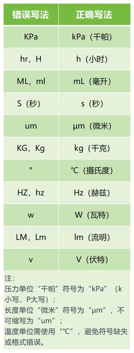 國(guó)際標(biāo)準(zhǔn)單位(SI單位)的書寫需嚴(yán)格遵循規(guī)范,避免因符號(hào)、大小寫錯(cuò)誤導(dǎo)致技術(shù)文件失效。部分示例如下: