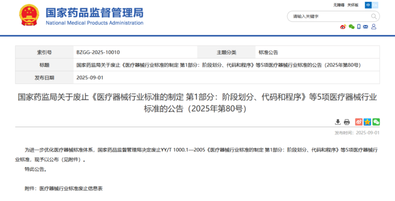 9月1日,國家藥監(jiān)局發(fā)布一則公告稱,該局決定廢止YY/T 1000.1-2005《醫(yī)療器械行業(yè)標準的制定 第1部分:階段劃分、代碼和程序》、YY/T 0869.1-2016《醫(yī)療器械 不良事件分級編碼結(jié)構(gòu) 第1部分:事件類型編碼》等5項醫(yī)療器械行業(yè)標準,具體明細如下: